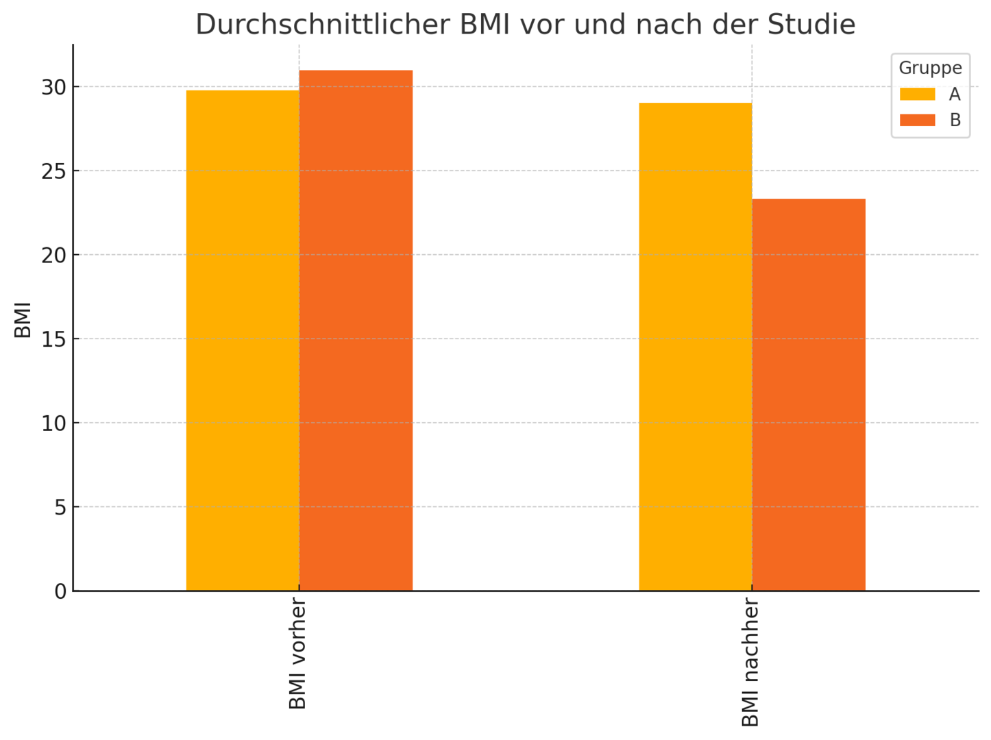 Die Ergbenisse der Studie haben sich auch in dem BMI der Testpersonen widergespiegelt. Im Schnitt konnte Gruppe B den BMI von der Obergrenze von 32 auf  23 senken.